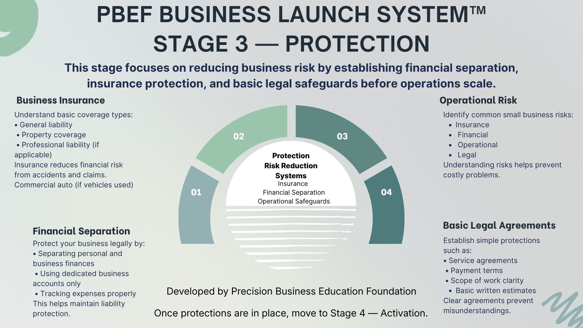 Once compliance requirements are confirmed, move to Protection to reduce financial risk and establish basic safeguards before activating operations.