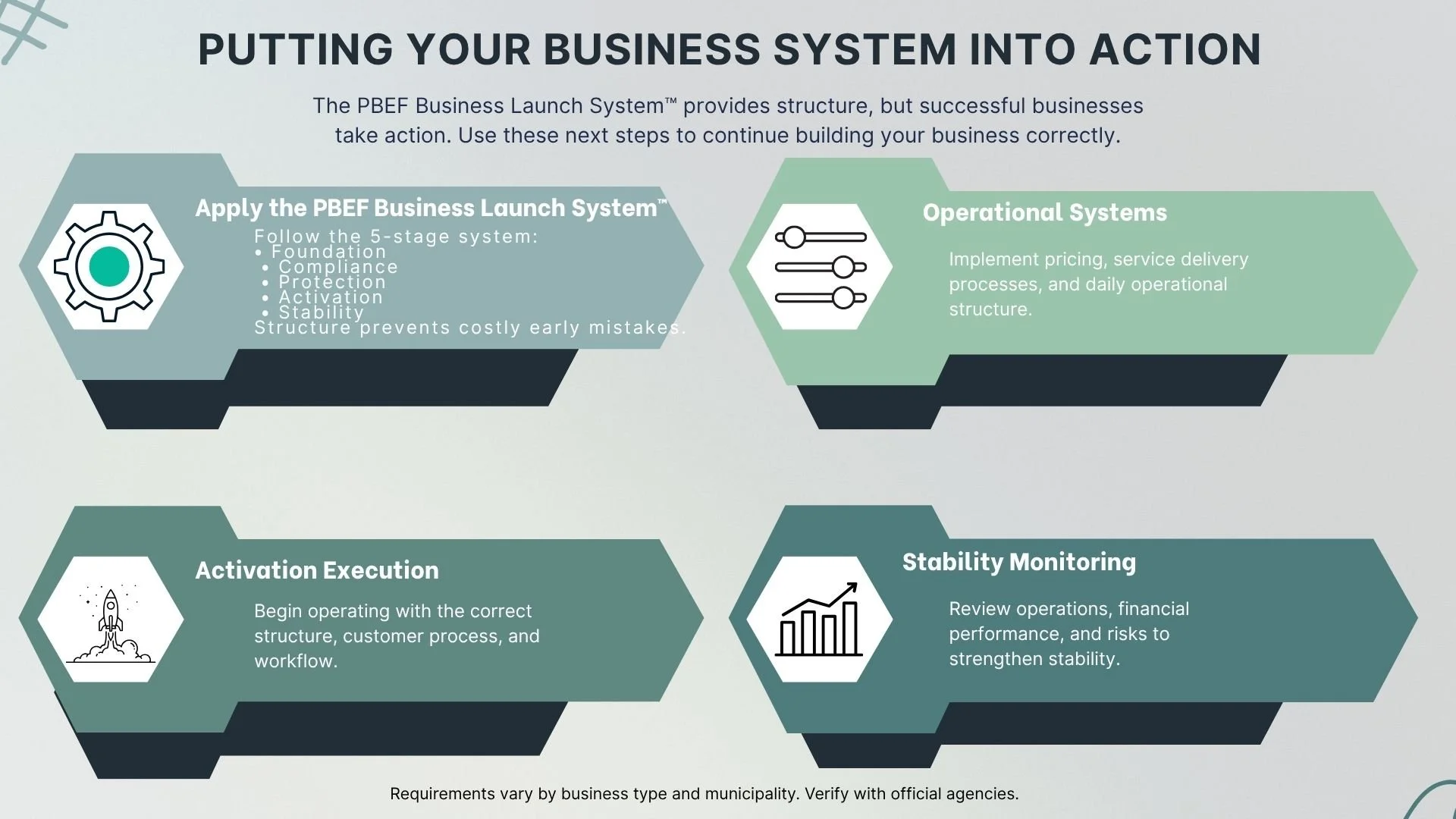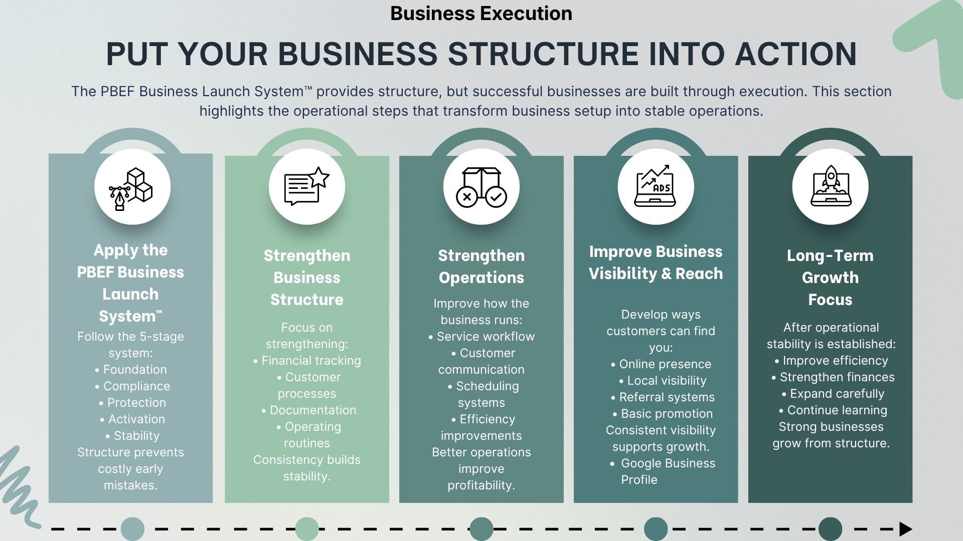 Each stage of the PBEF Business Launch System™ helps entrepreneurs move from idea to stable operation with clear structure and local requirements.