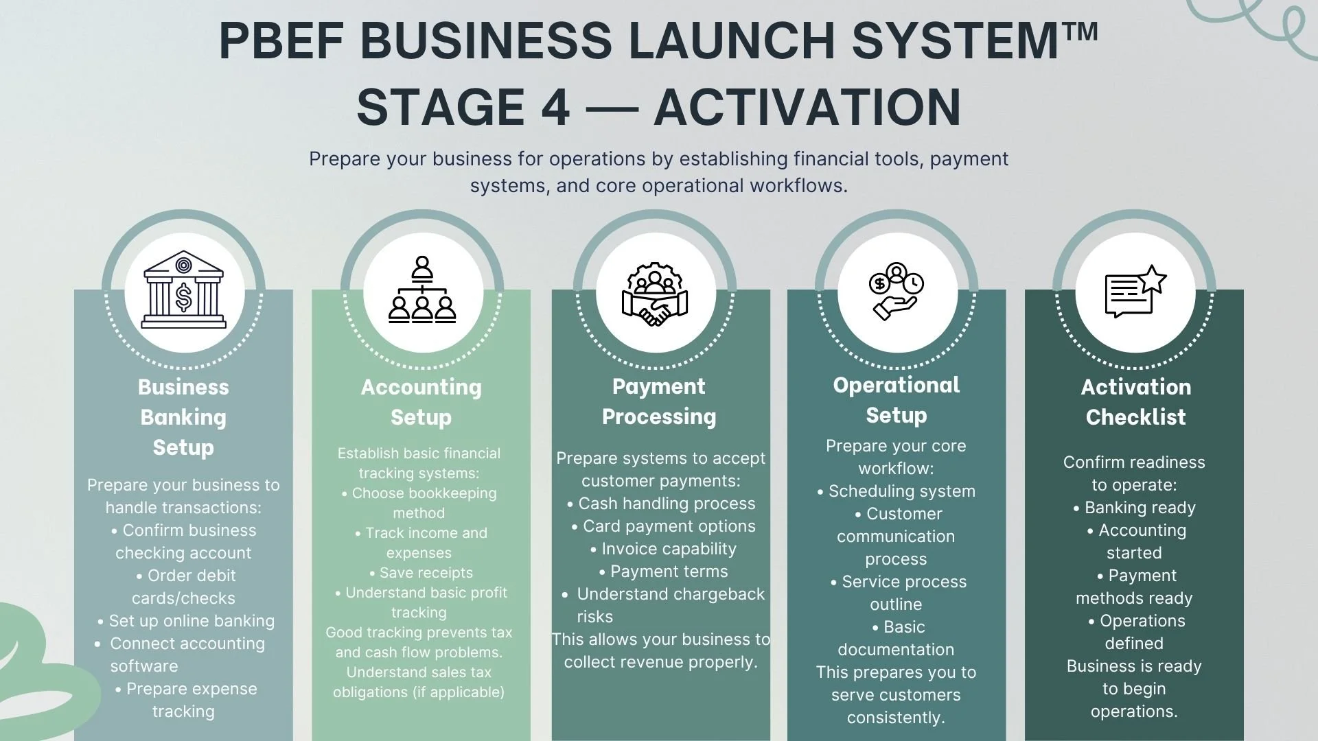 Once protection systems are in place, move to Activation to establish financial tools, payment systems, and operational workflows needed to begin serving customers.