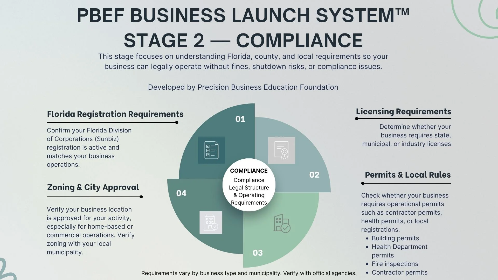 The Compliance stage ensures your business meets Florida, Sarasota County, and municipal requirements before operating.
