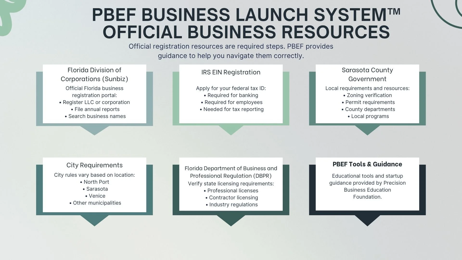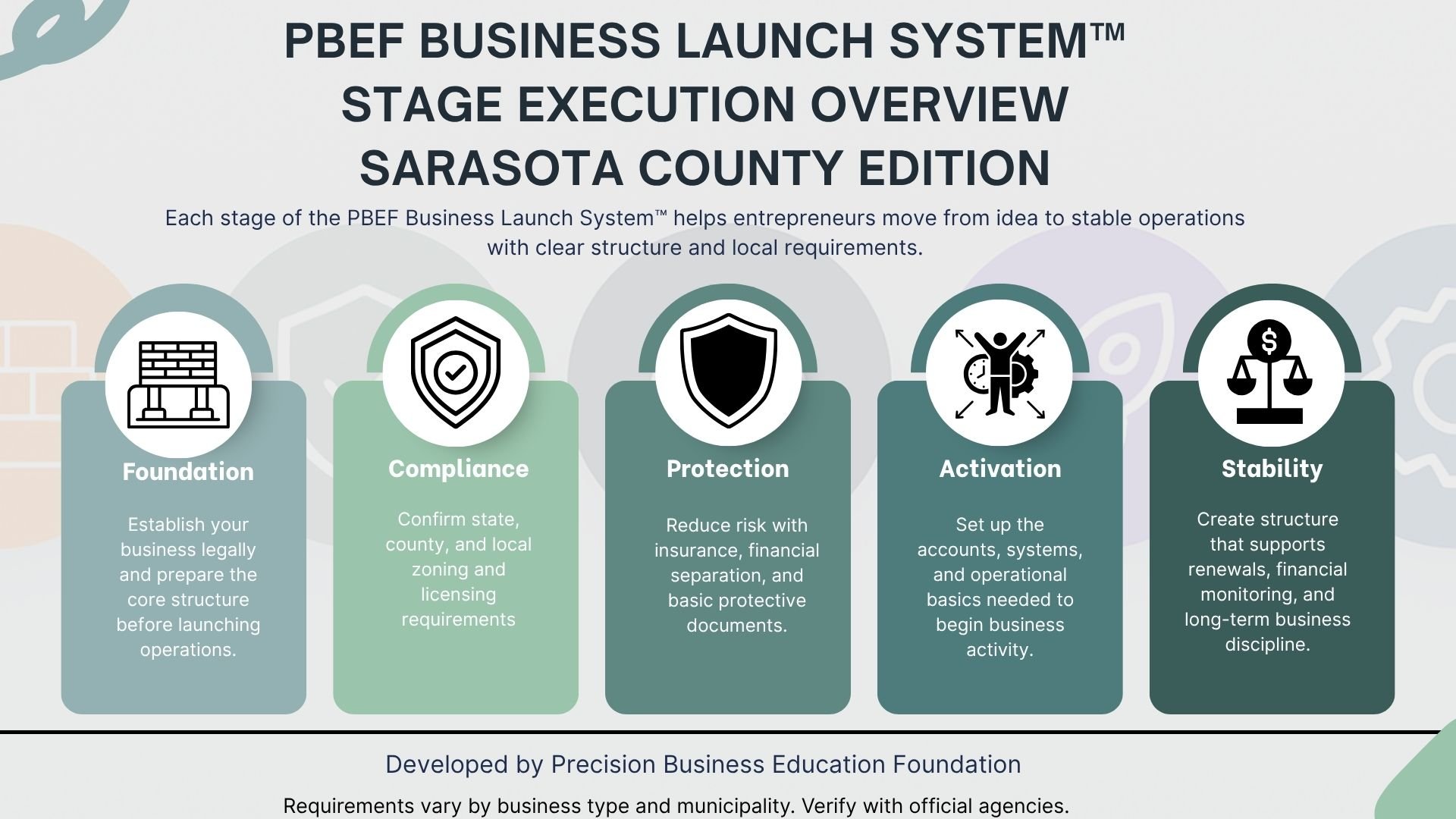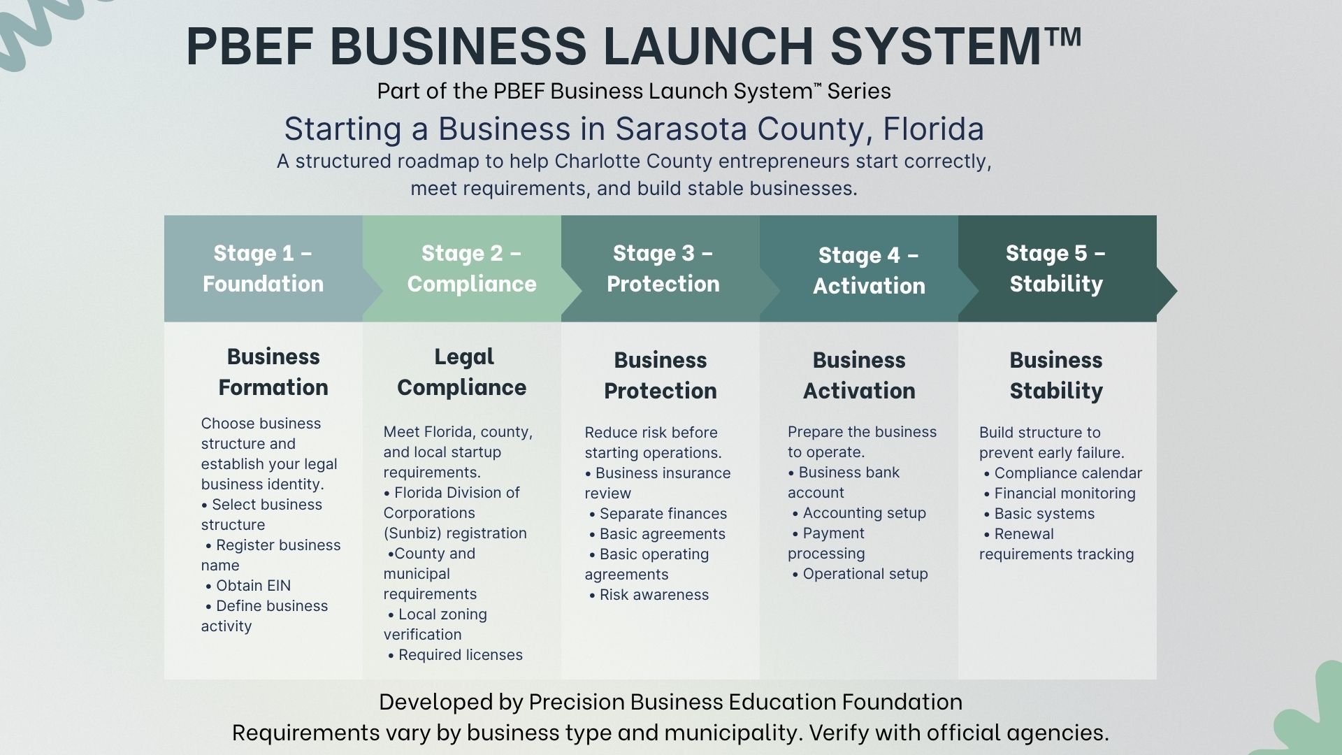 The PBEF Business Launch System™ is a structured 5-stage framework designed to help Sarasota County entrepreneurs start correctly and build stable businesses.