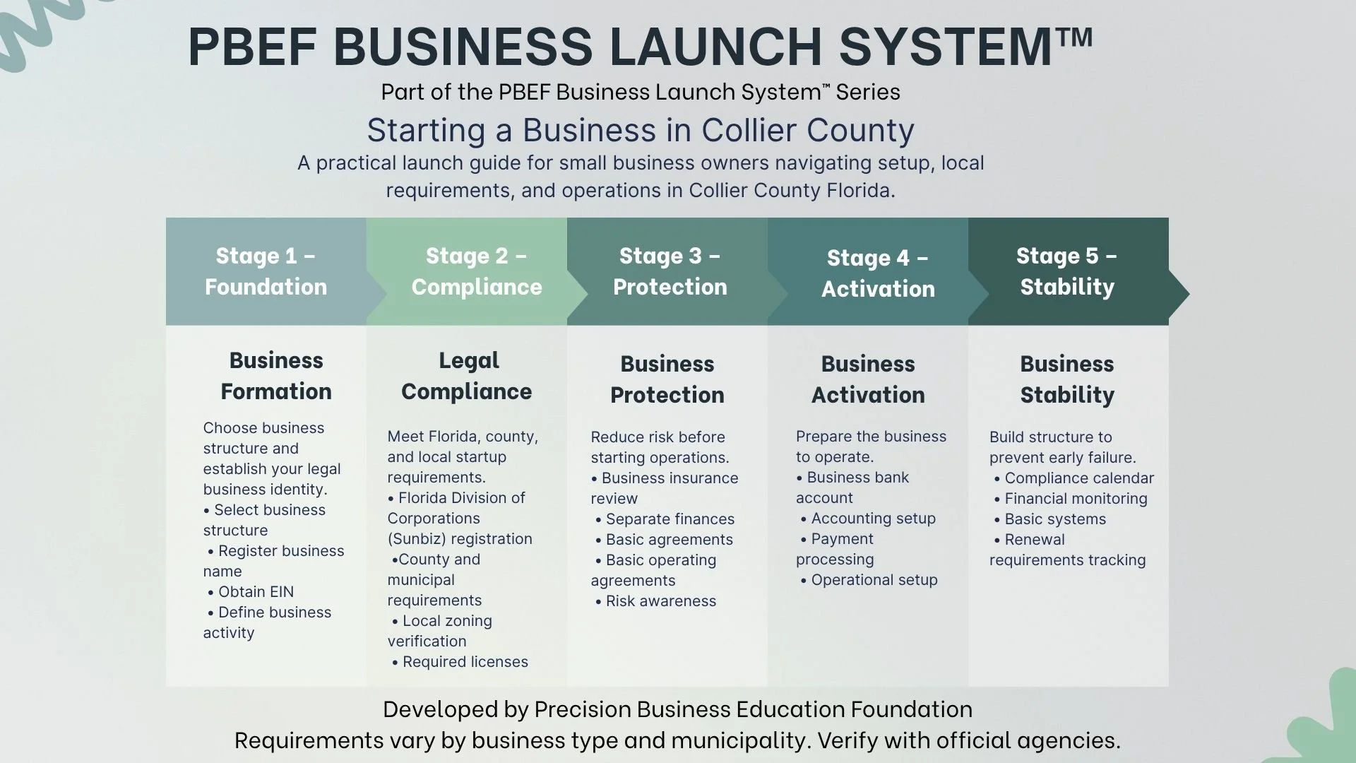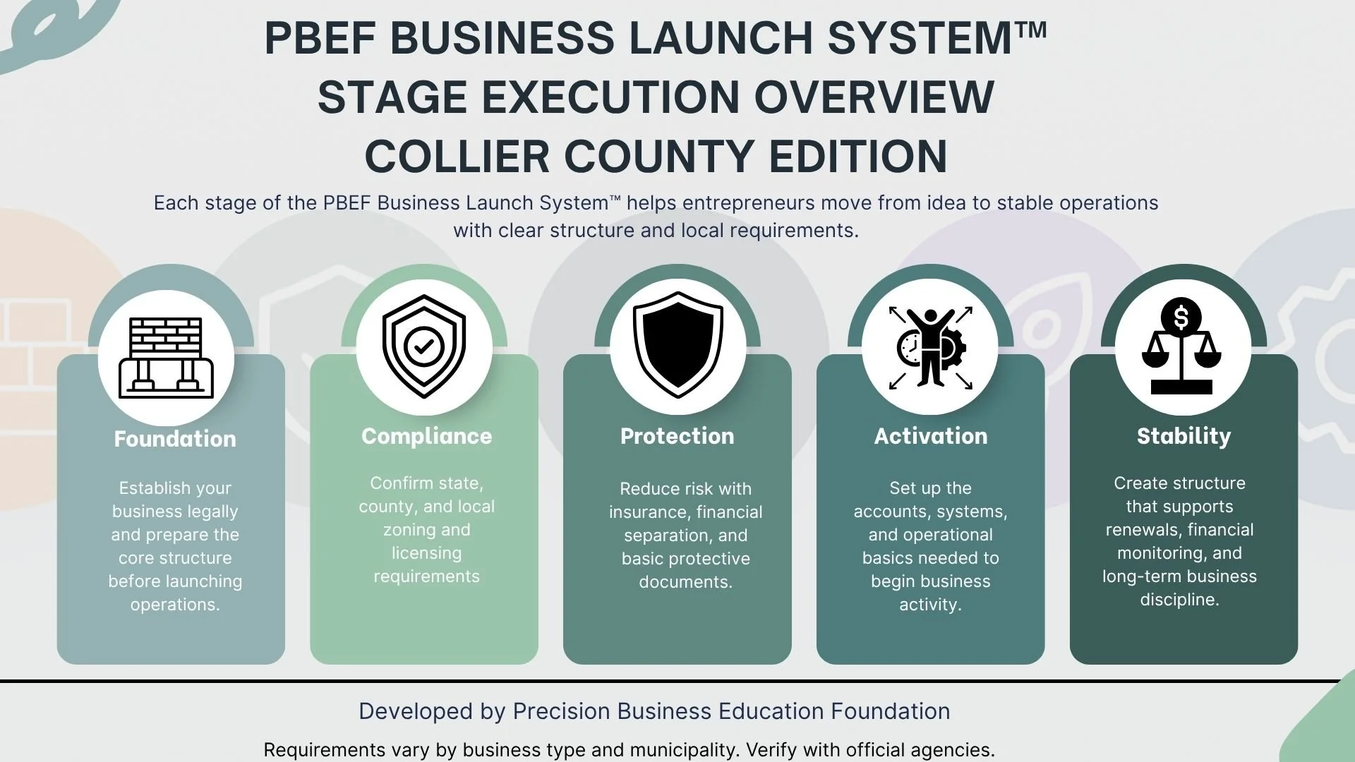 The Compliance stage ensures your business meets Florida, Collier County, and municipal requirements before operating.